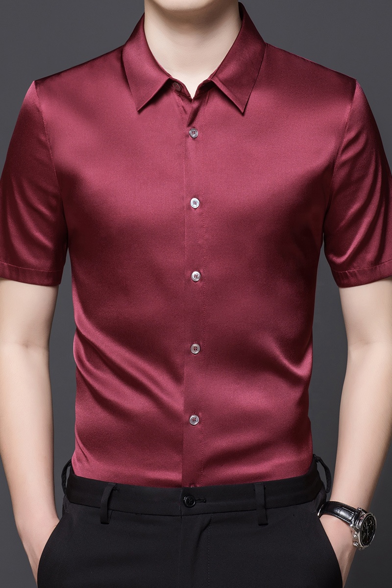 2023 High Quality Business Stand Collar Silk Shirt For Men Solid Color 90.4% Silk Short Sleeve Men's Shirt