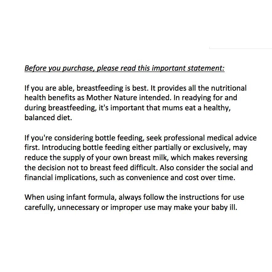 ** Important Notice: Breast milk is the best for babies. The World Health recommends exclusive breastfeeding for the first six months of life. Unnecessary introduction of bottle feeding or other food and drinks will have a negative impact on breastfeeding. After six months of age, infants should receive age breastfeeding continues for up to two years of age or beyond. Consult appropriate foods while your doctor before deciding to use infant formula or if you have difficulty breastfeeding.